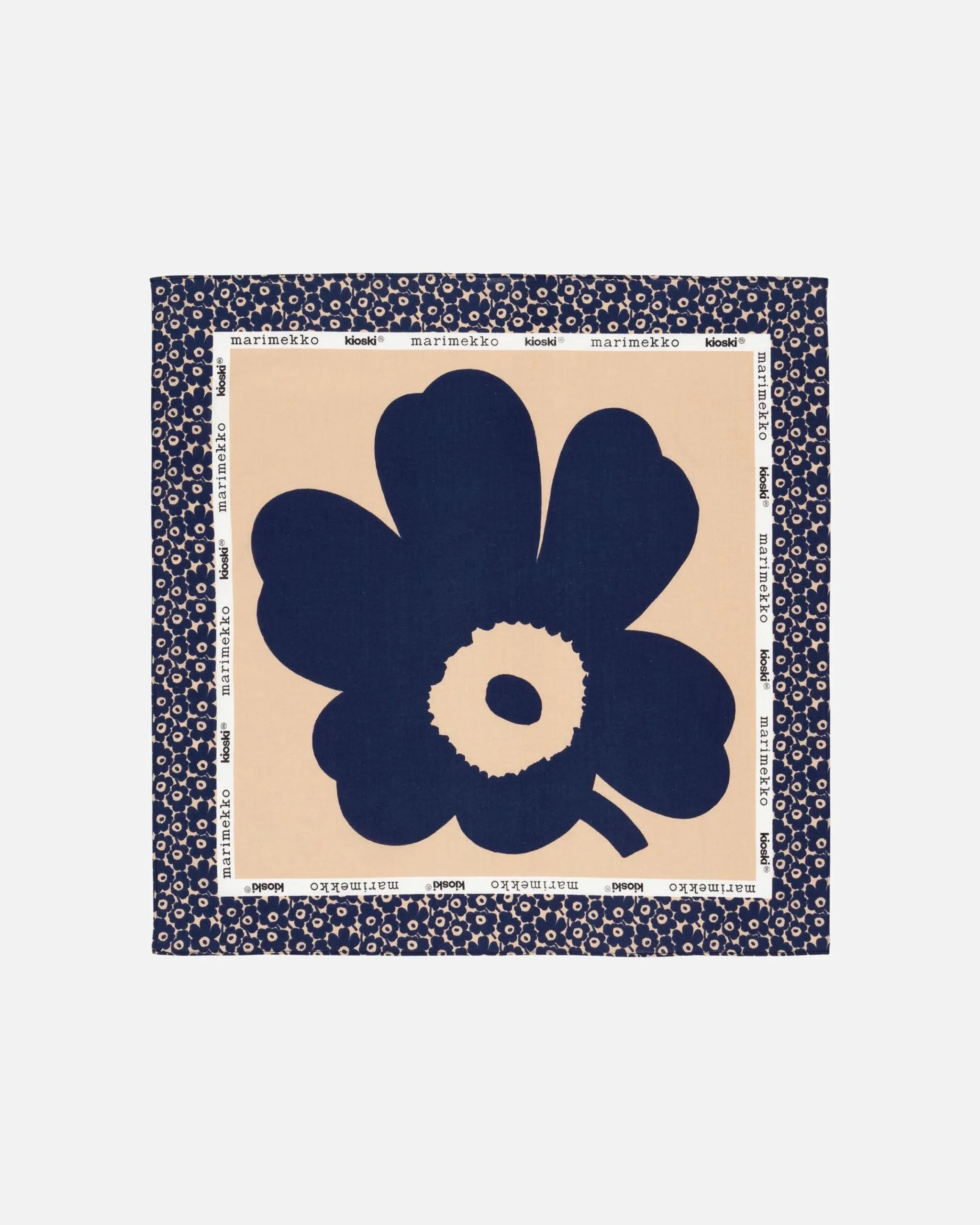 Luomupuuvillasta Valmistetussa Astrilli-Huivissa On Suuri Unikko-Kukka Keskellä Ja Pikkuista Unikko-Kukkaa Reunoilla. Huivin Sisäreunaa Kiertää Marimekon Printtiteksti.