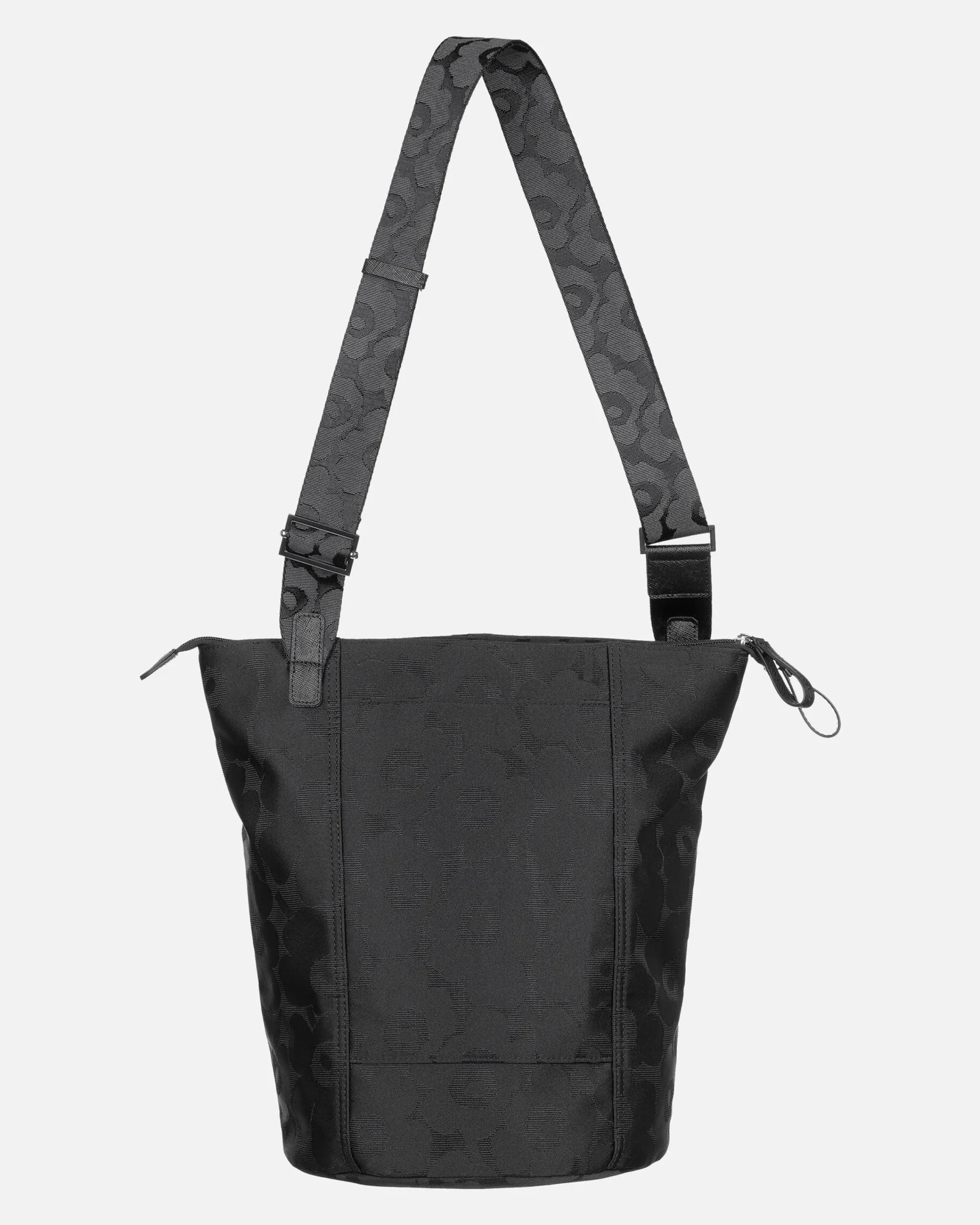 Laukussa On Kolme Osastoa: Yksi Vetoketjulla Suljettava Ja Kaksi Avointa Osastoa, Joista Toisessa On Sisätasku. Laukussa On Säädettävä Olkahihna. Etupuolelle On Kiinnitetty Marimekko-Avaimenperä Ja Takapuolella On Yksi Avoin Tasku, Joka Sulkeutuu Magneettinapilla.
