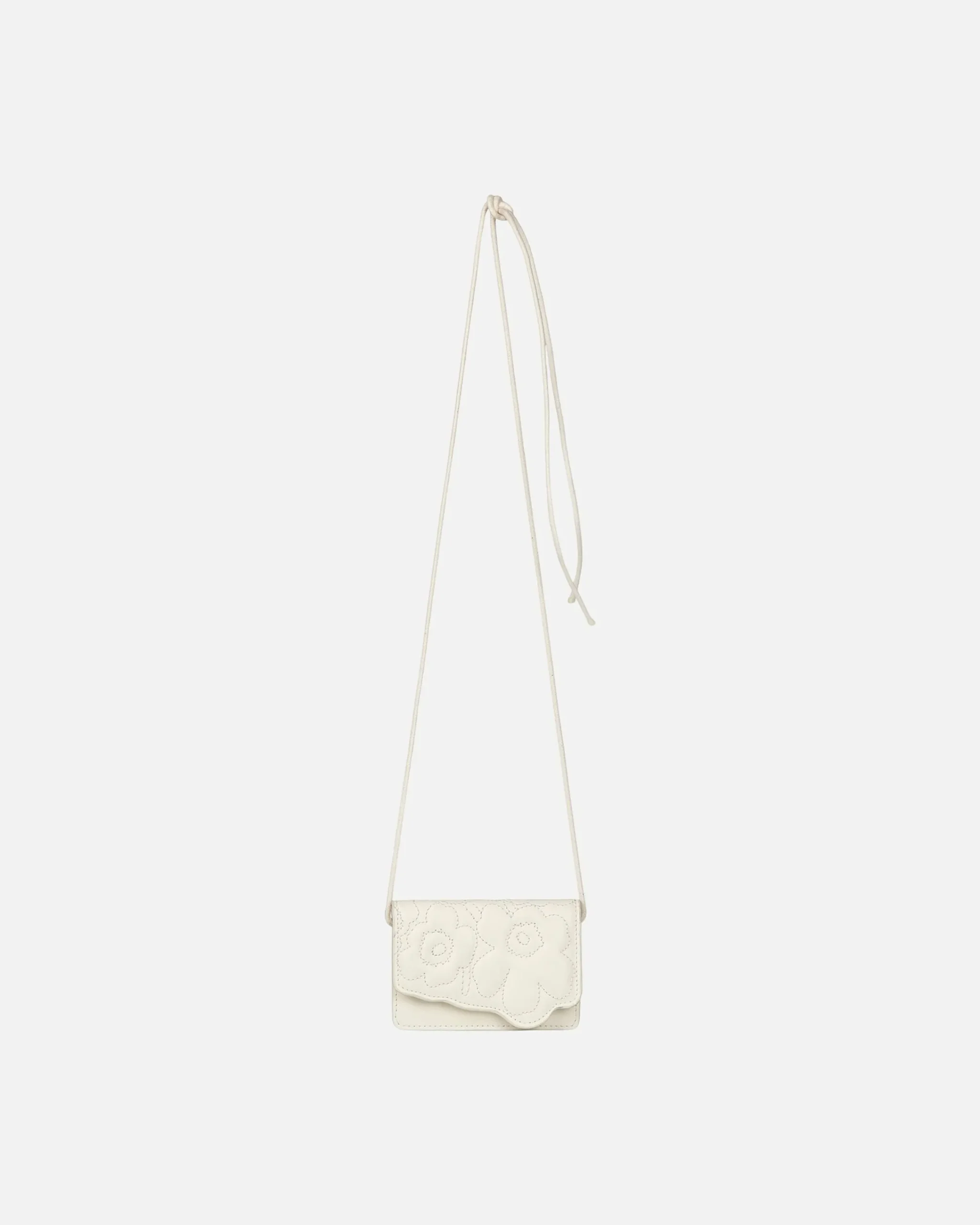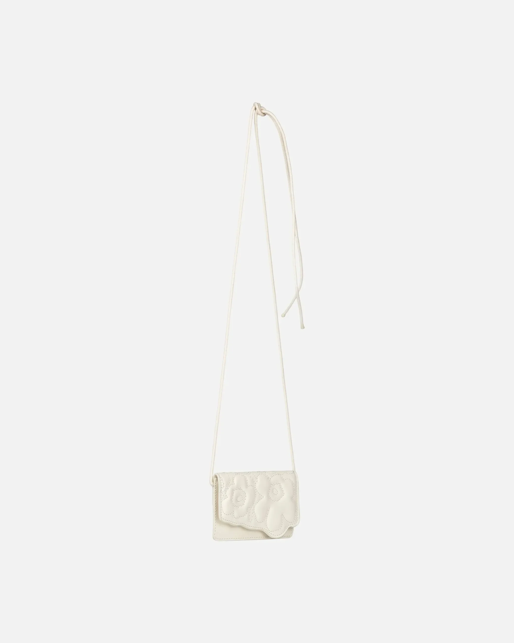 Nahasta Valmistetussa Vyölaukussa On Pehmustettu Kansi, Johon On Tikattu Unikko-Kuosi. Kansi Sulkeutuu Painonapilla Ja Laukussa On Puuvillahihna. Korteille Tarkoitettua Pientä Vyölaukkua Voi Kantaa Monella Eri Tavalla: Vyötäröllä, Kaulan Ympärillä Tai Olan Yli.