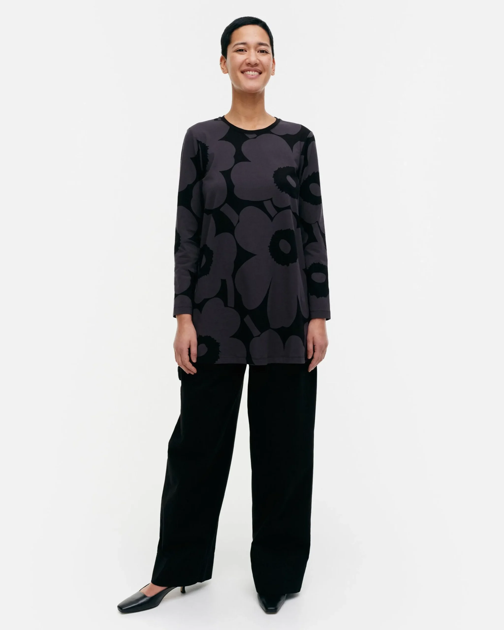 Kevät-Tunika On Valmistettu Luomupuuvillatrikoosta Ja Siinä On Väljä Istuvuus, Suora Leikkaus Ja Unikko-Kuosi. Tunikassa On Kuosillinen Resori Pyöreässä Pääntiessä Ja Väljät Pitkät Hihat.