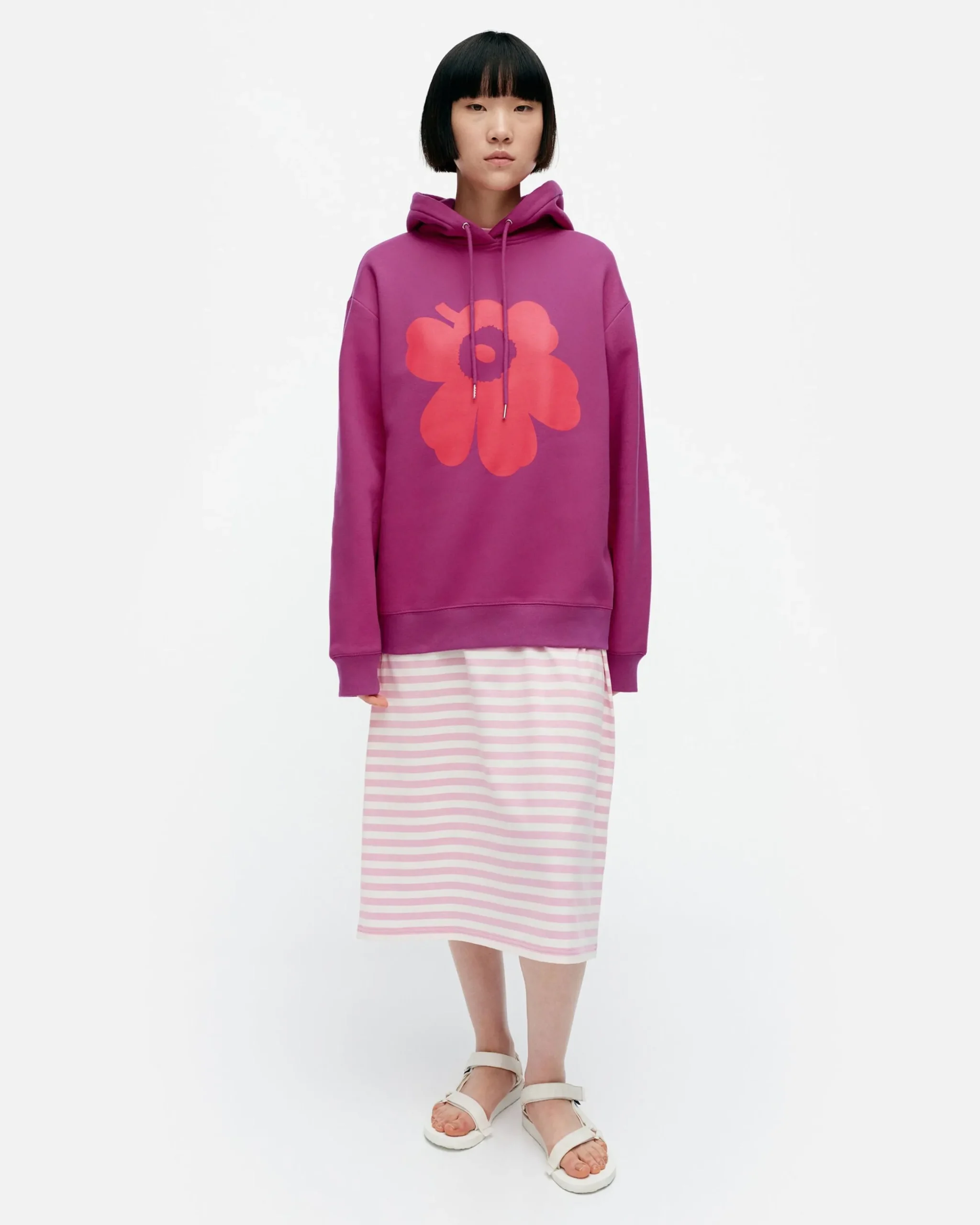 Puuvillacollegesta Valmistetussa Runoja-Hupparissa On Rento Istuvuus Ja Etupuolella Suuri, Painettu Unikko-Kukka. Hupussa On Kiristysnauhat Ja Hihansuissa Sekä Helmassa On Leveät Resorit.