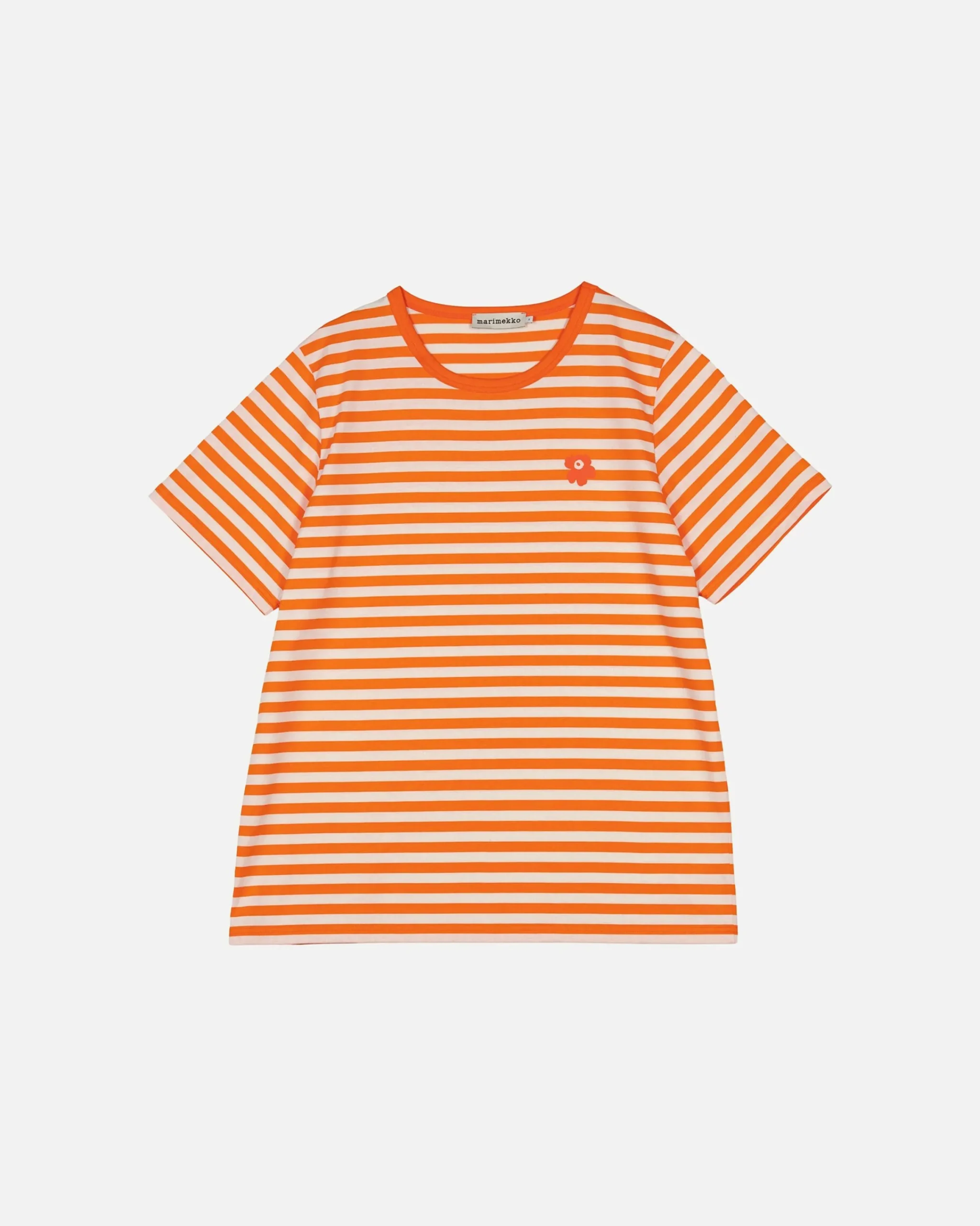 Shortsleeve-T-Paita On Valmistettu Puuvillatrikoosta Ja Siinä On Miesten Mitoitus. T-Paidassa On Tasaraita-Kuosi Ja Rintaan On Painettu Pieni Unikko-Kuosin Kukka. Pyöreä Pääntie On Viimeistelty Resorilla.