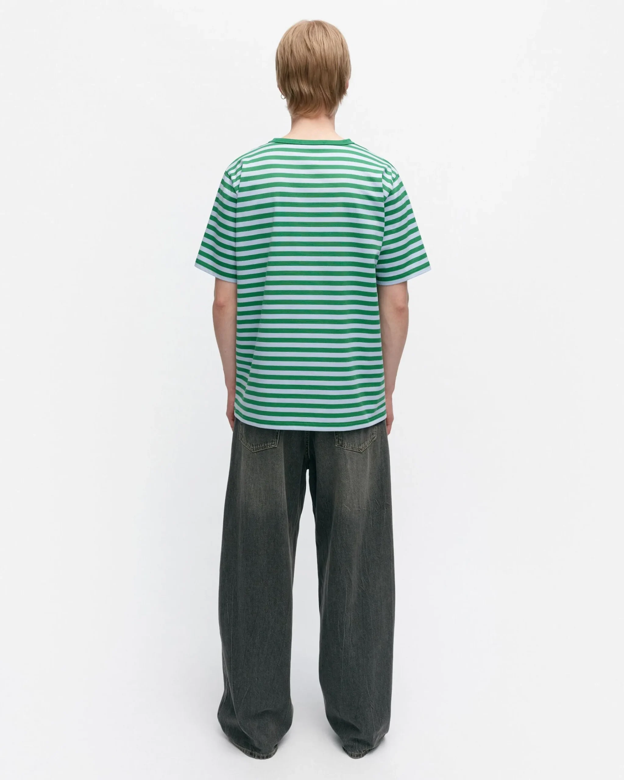 Tasaraita Men’S Shortsleeve -Paita On Valmistettu Tasaraita-Kuosisesta Puuvillasta, Johon On Painettu Pieni Unikko-Kuosin Kukka Etupuolelle. T-Paidassa On Resorikantti Pääntiellä. Tuotteessa On Miesten Mitoitus, Joka Tuo Siihen Lisää Väljyyttä Rinnan Ja Hartian Kohdalle Sekä Lisää Pituutta Hihoihin Ja Helmaan.