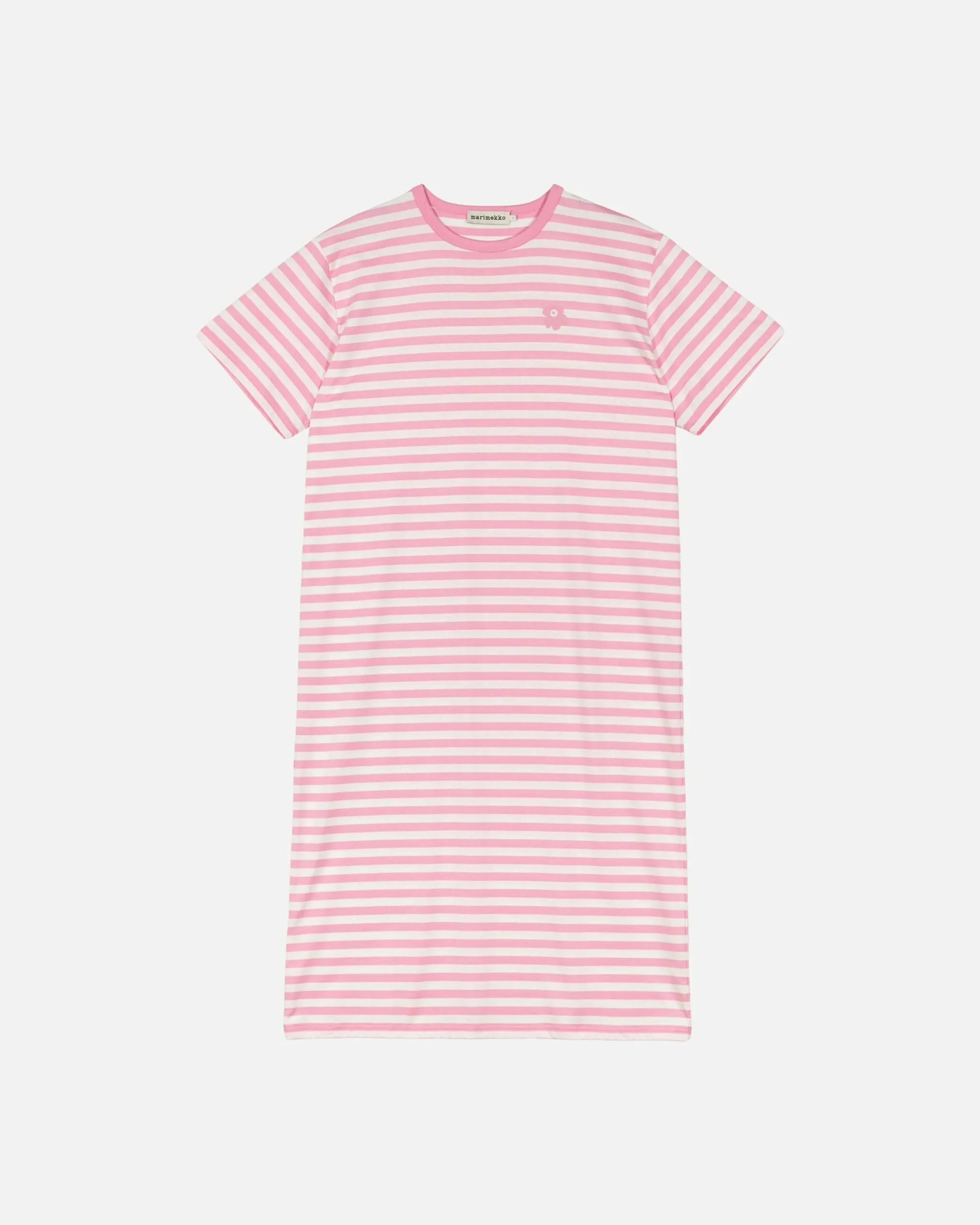 Oversized-T-Paita-Mekko On Valmistettu Puuvillatrikoosta Ja Siinä On Väljä Istuvuus. Mekossa On Tasaraita-Kuosi Ja Rintaan On Painettu Pieni Unikko-Kuosin Kukka. Pyöreä Pääntie On Viimeistelty Resorilla.