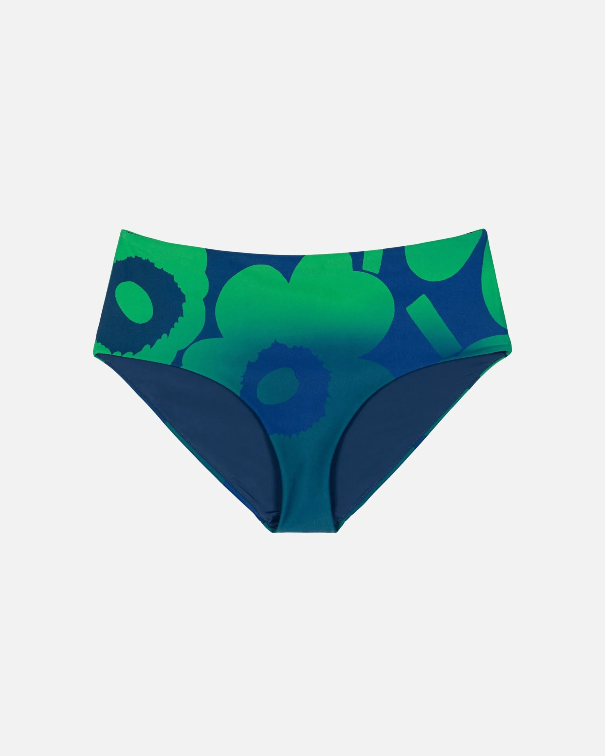 Korkeavyötäröisessä Myrtos-Bikinialaosassa On Liukuvärjätty Unikko-Kuosi, Jossa Värit Vaihtuvat Vihreästä Siniseen. Bikinialaosa On Kokonaan Vuoritettu. Materiaalilla On Upf 50+ -Luokitus.