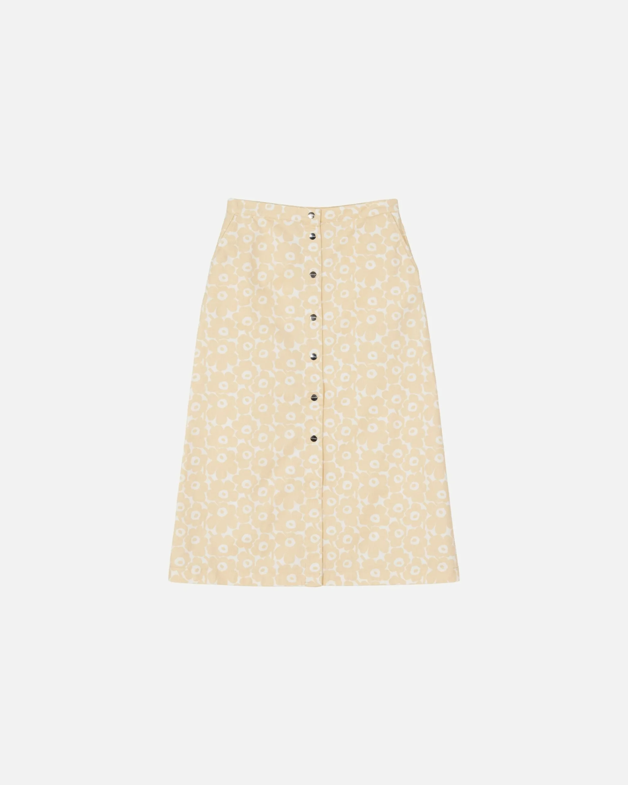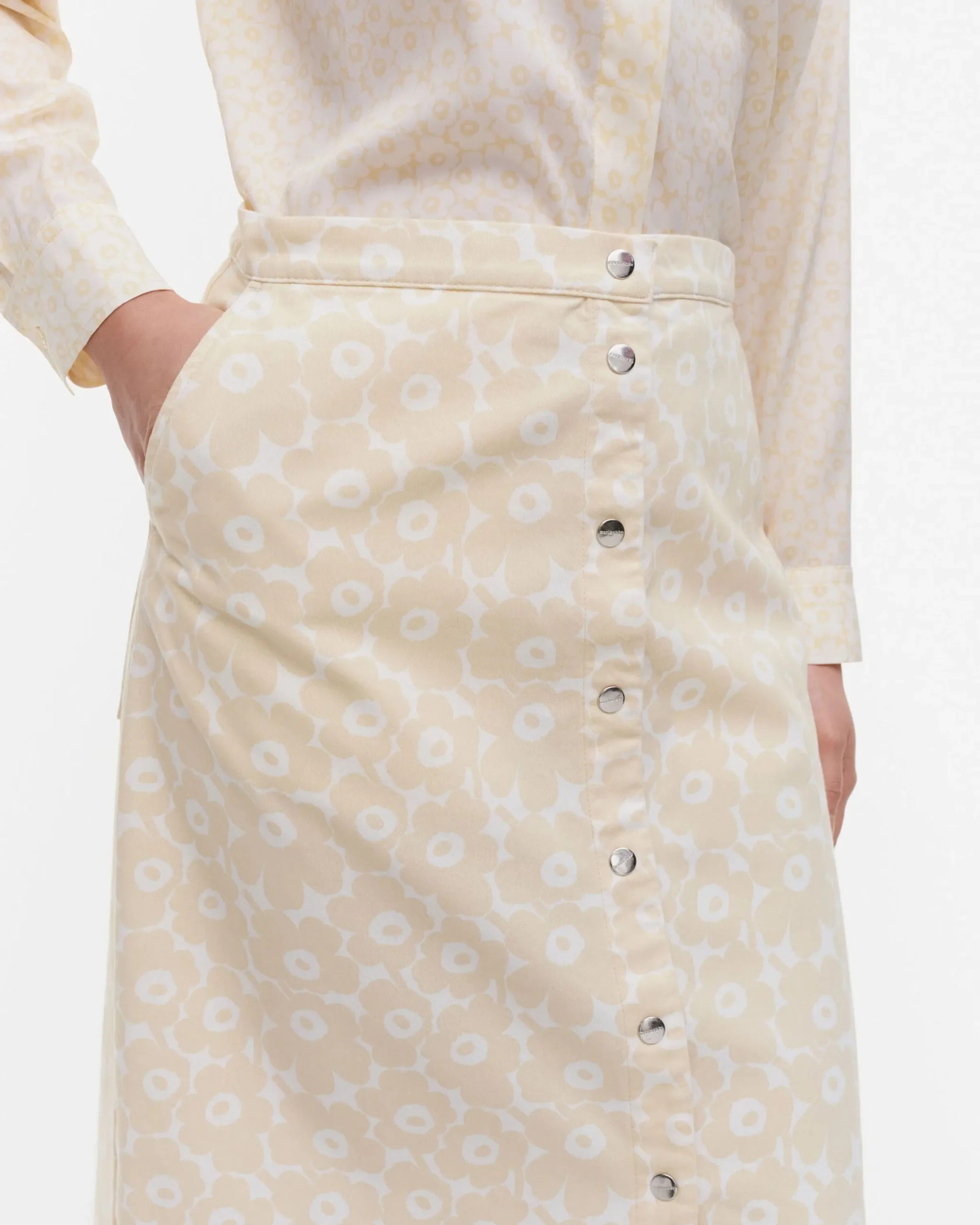 Puoli-Hame On Valmistettu Luomupuuvillatvillistä Ja Siinä On Niukka Istuvuus, Suora Leikkaus Sekä Unikko-Kuosi. Hameessa On Vyötärökaitale, Jossa On Takana Leveä Vyölenkki, Painonappisuljenta Edessä Ja Viistot Sivutaskut. Takana On Isot Paikkataskut.