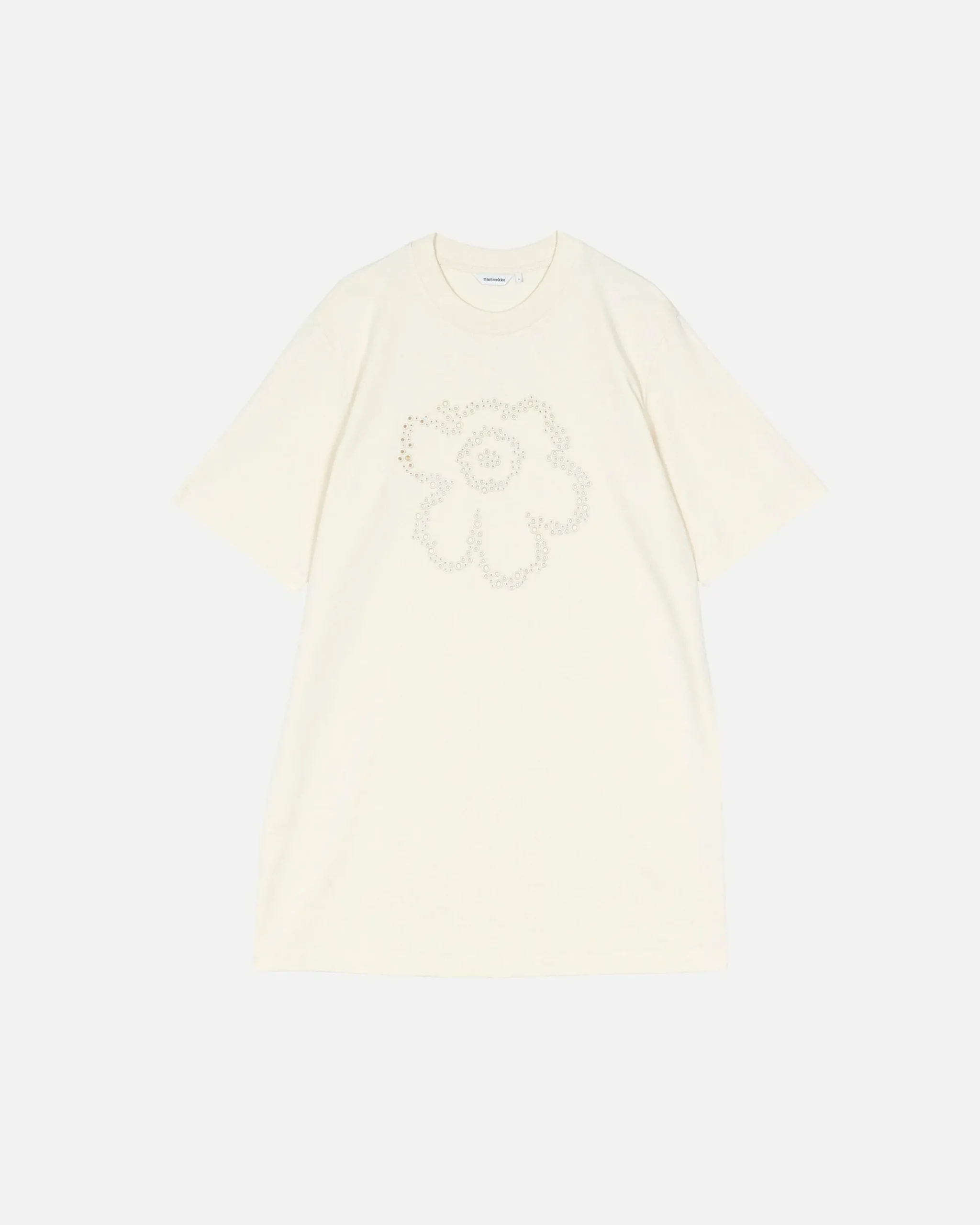 Säteet-T-Paitamekko On Valmistettu Luomupuuvillatrikoosta Ja Siinä On Väljä Istuvuus, Suora Leikkaus Sekä Pitsimäisesti Brodeerattu Unikko-Kukka Etupuolella. Mekossa On Leveä Resori Pyöreässä Pääntiessä Ja Väljät, Kyynärmittaiset Hihat.