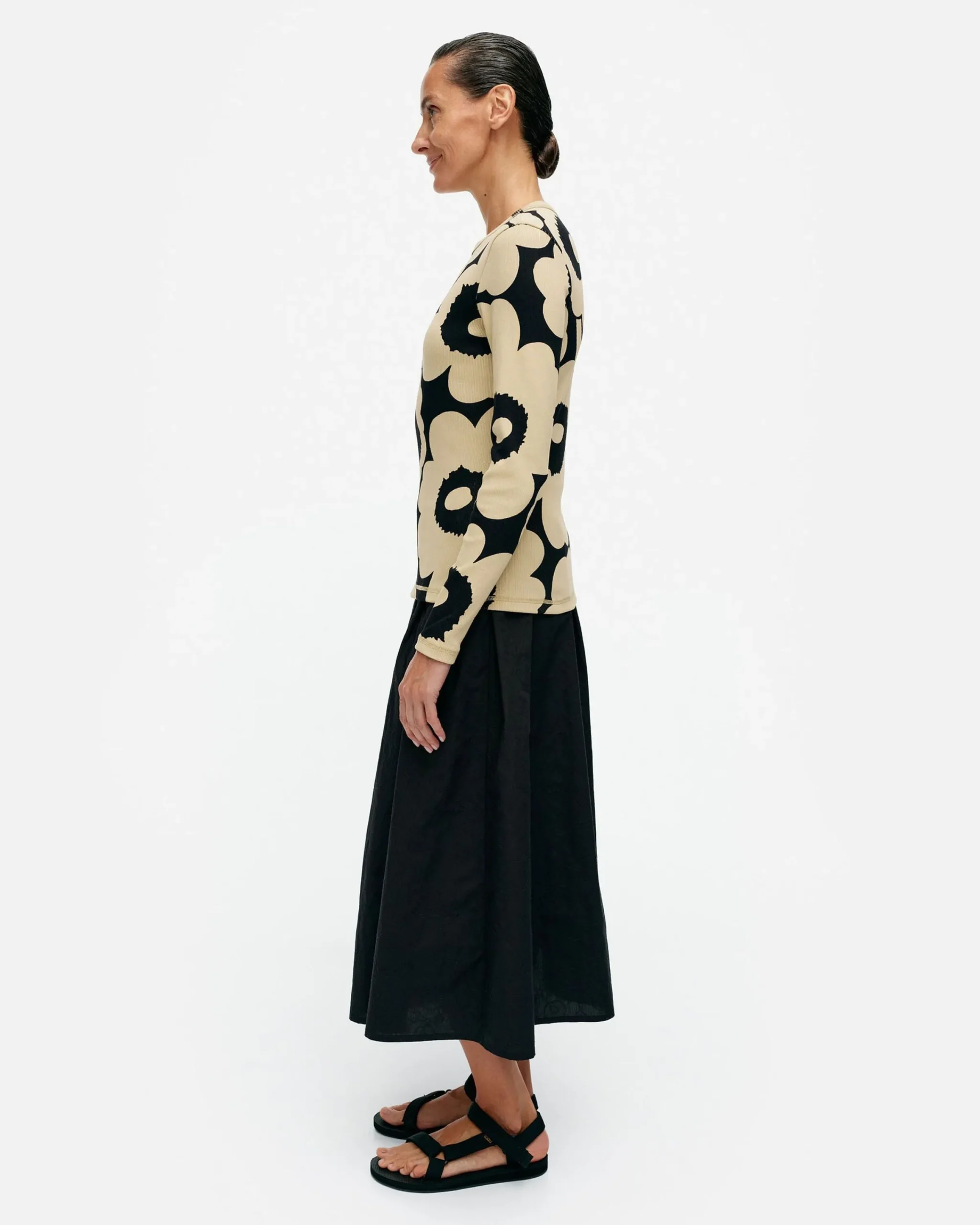 Tulva-Paita On Valmistettu Puuvillaribbistä Ja Siinä On Niukka Istuvuus, Suora Leikkaus Sekä Unikko-Kuosi. Pitkähihaisessa Paidassa On Omalla Kankaalla Viimeistelty Pyöreä Pääntie.