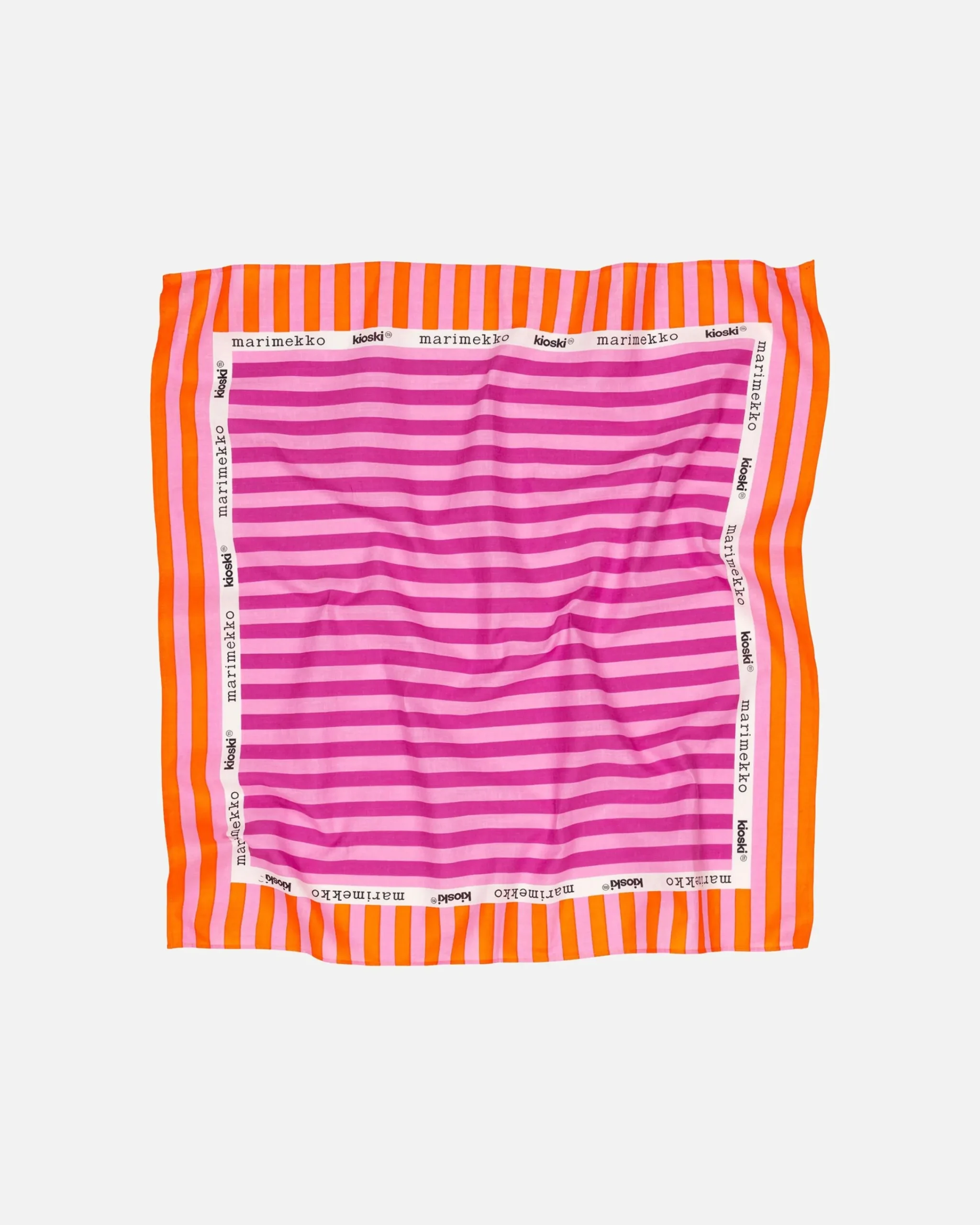 Luomupuuvillasta Valmistetussa Astrilli-Huivissa On Kaksi Eriväristä Tasaraita-Kuosia. Huivin Sisäreunaa Kiertää Marimekon Printtiteksti.