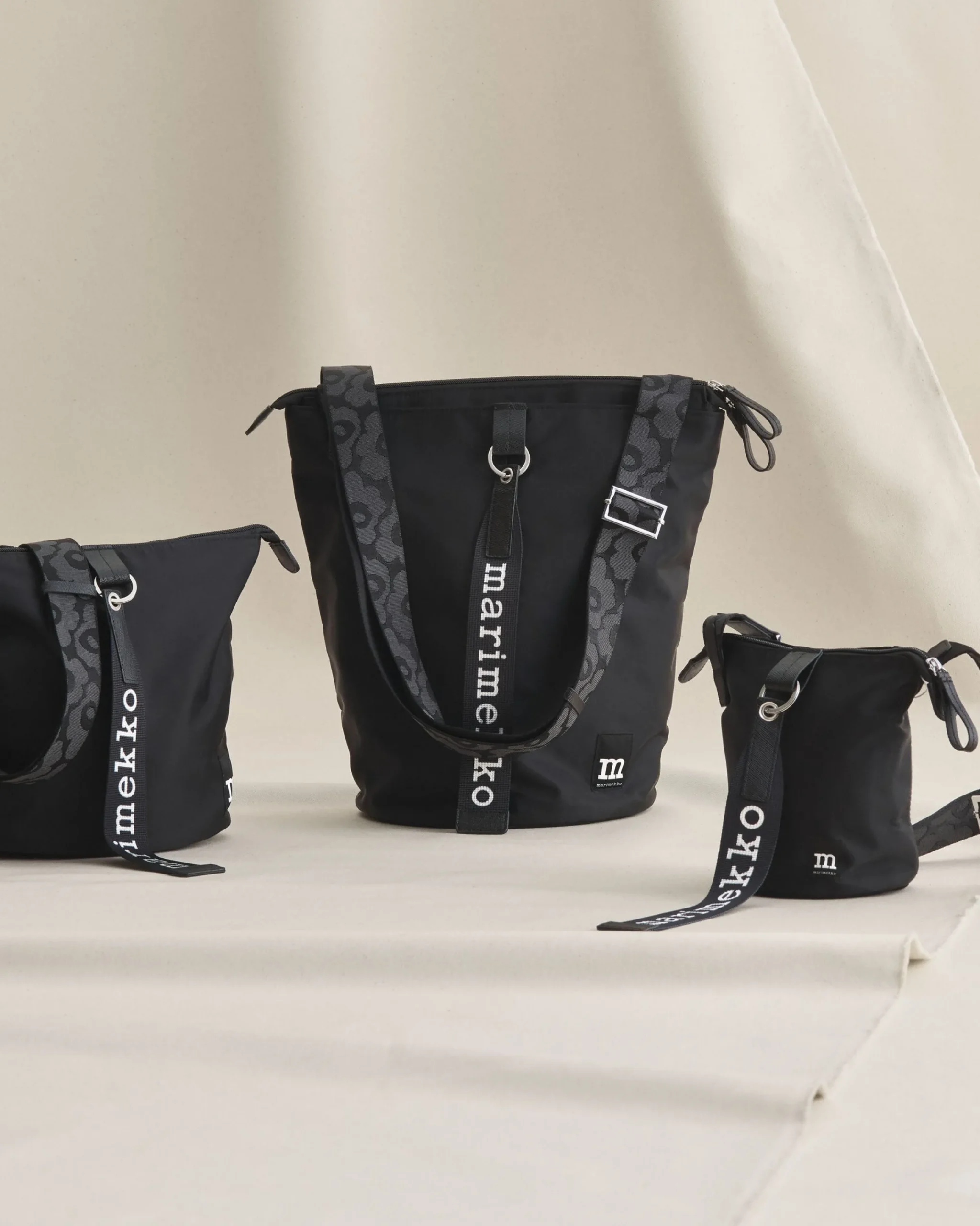 Laukussa On Kolme Osastoa: Yksi Vetoketjulla Suljettava Ja Kaksi Avointa Osastoa, Joista Toisessa On Sisätasku. Laukussa On Säädettävä Olkahihna. Etupuolelle On Kiinnitetty Marimekko-Avaimenperä Ja Takapuolella On Yksi Avoin Tasku, Joka Sulkeutuu Magneettinapilla.