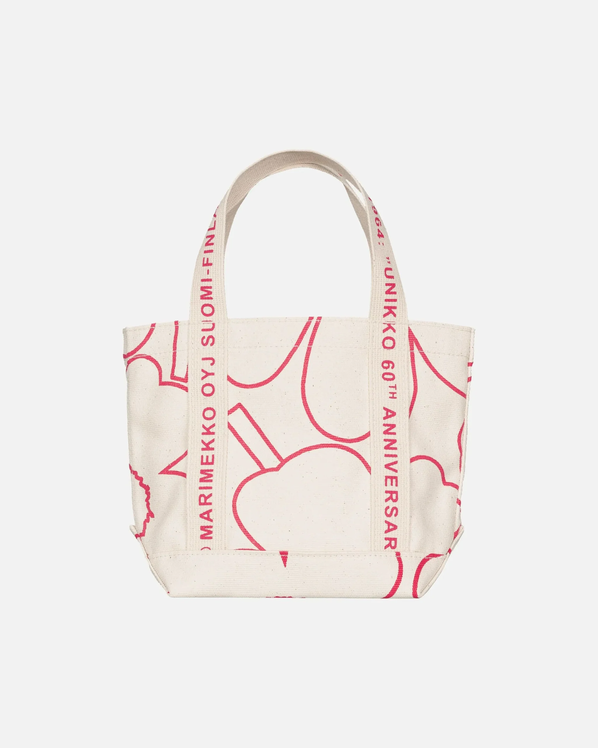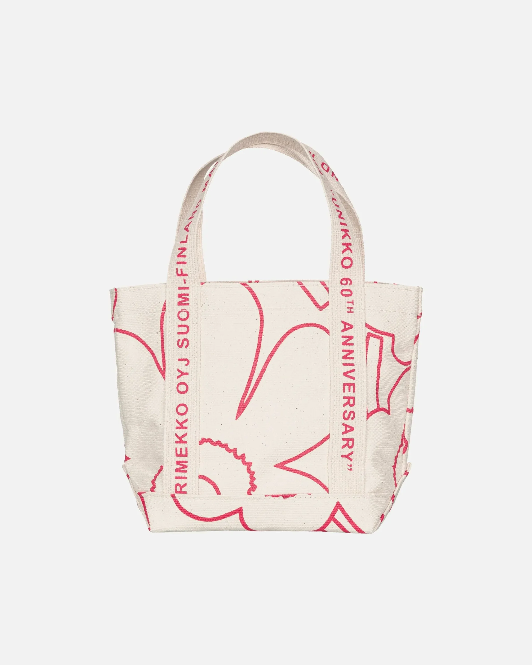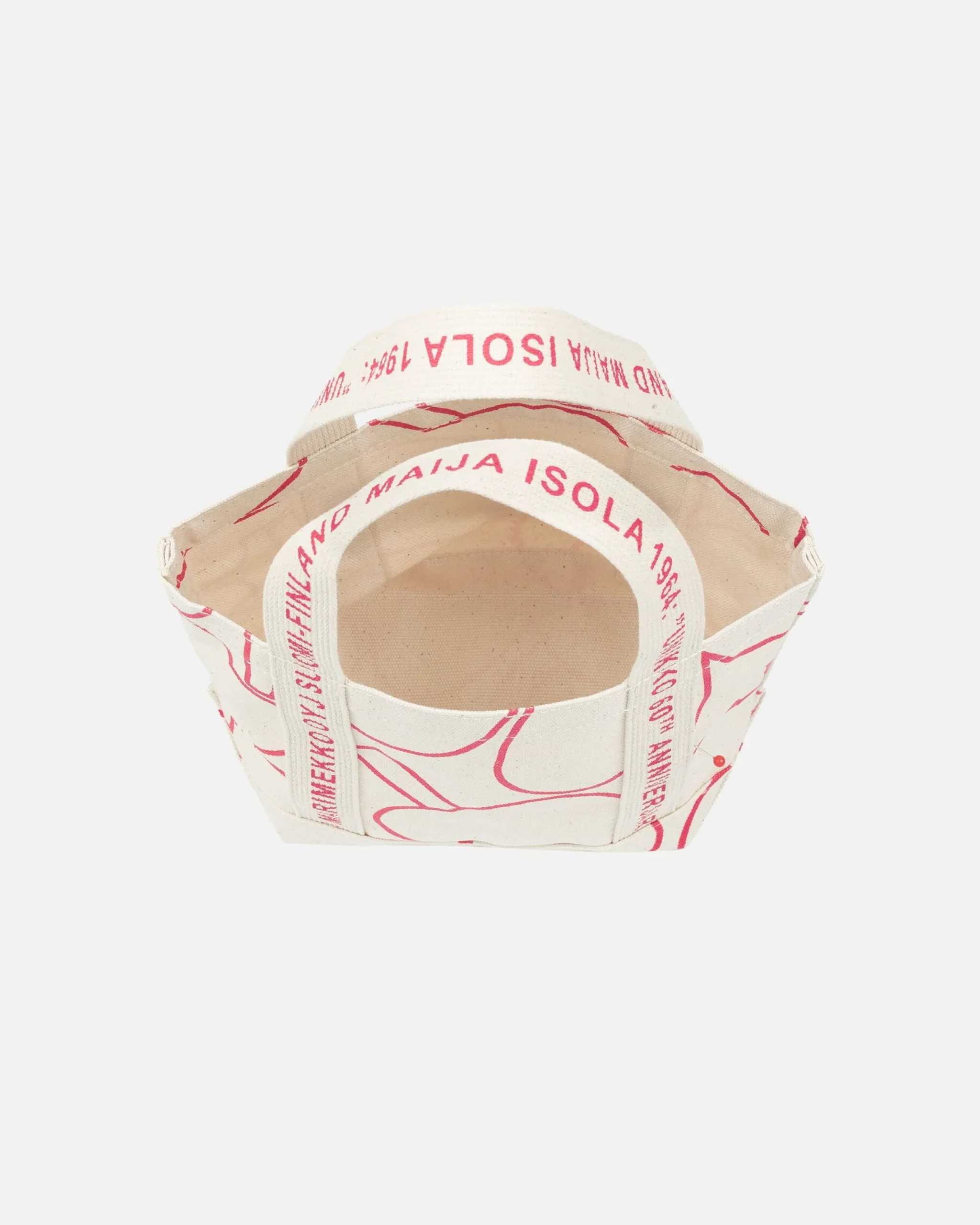 Carrier Mini -Laukku On Valmistettu Valkaisemattomasta, Piirto Unikko -Kuosisesta Puuvillapellavasta, Joka On Painettu Helsingissä. Marimekko Kioski -Tekstillä Painettu Puuvillanauha Kulkee Laukun Päällä Muodostaen Samalla Laukun Kantokahvat.
