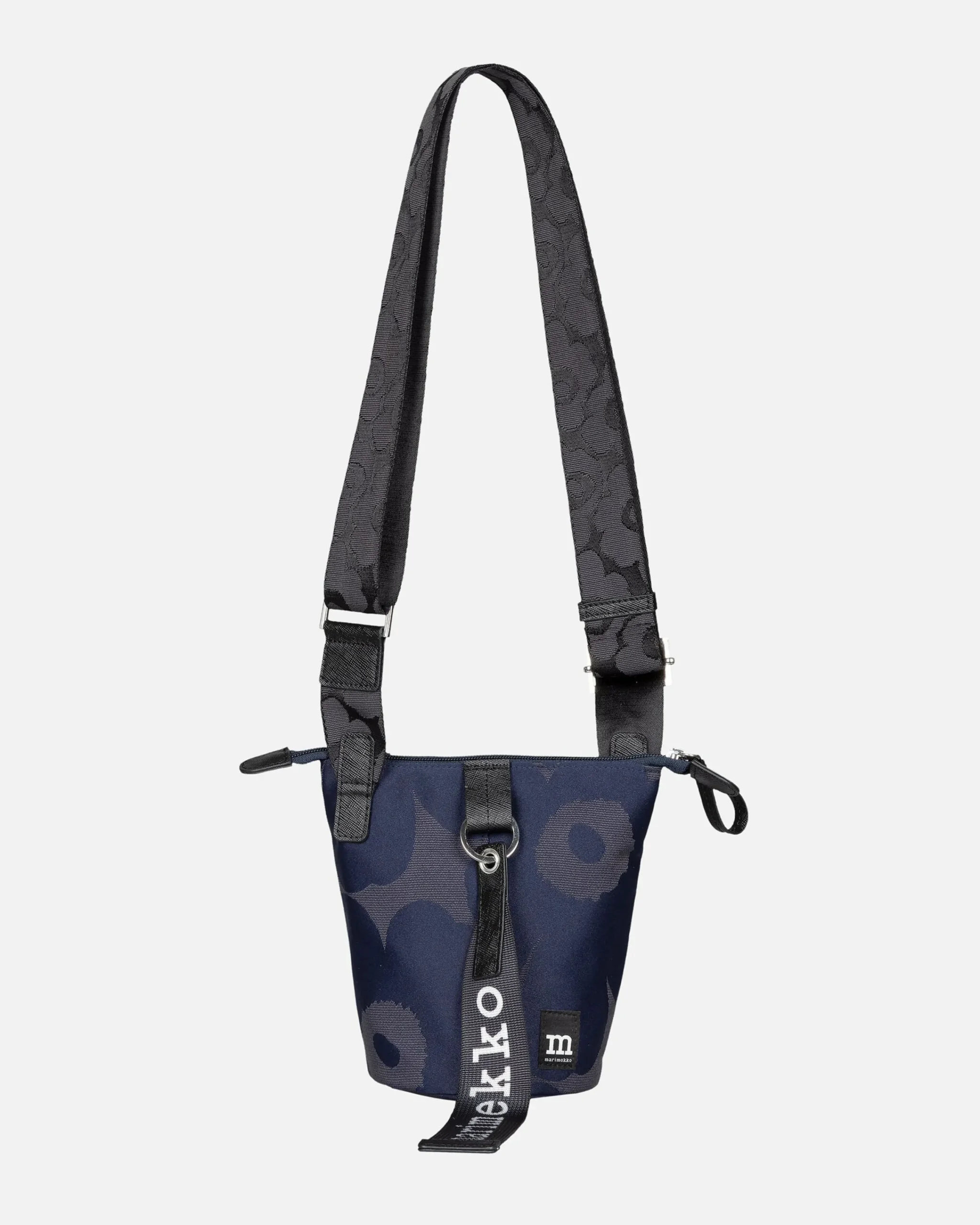 Essential Bucket -Olkalaukku On Valmistettu Kierrätetystä Polyesteristä, Jossa On Jacquard-Kudottu Unikko-Kuosi. Pienessä Laukussa On Vetoketjukiinnitys Ja Säädettävä Olkahihna. Etupuolelle On Kiinnitetty Marimekko-Avaimenperä Ja Takapuolella On Yksi Avoin Tasku. Laukussa On Nahkaisia Yksityiskohtia.