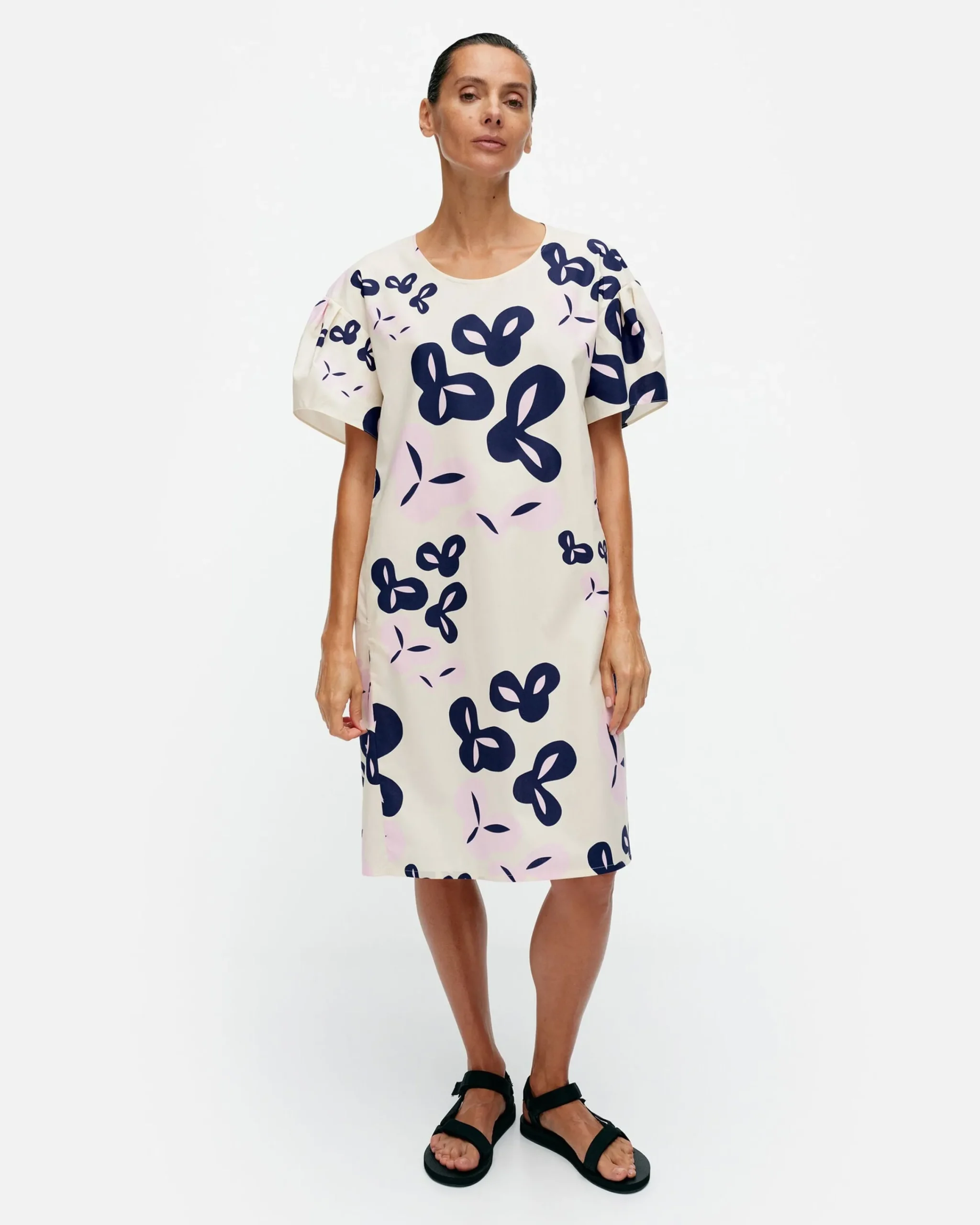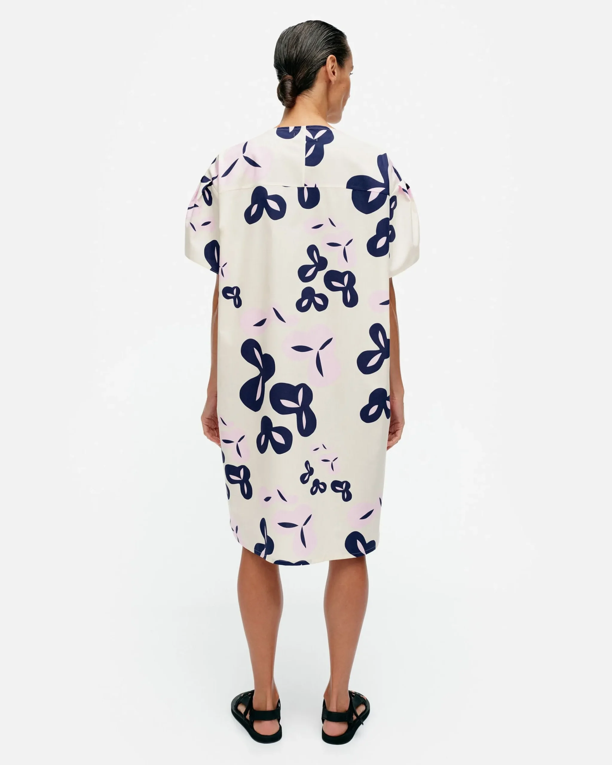 Poiminto-Kuosinen Avomeri-Mekko On Valmistettu Luomupuuvillapopliinista Ja Siinä On Rento Istuvuus Sekä Suora Leikkaus. Mekossa On Pyöreä, Avara Pääntie Ja Lyhyet, Olalta Pudotetut Hihat, Joissa On Poimutusta Hihan Pyöriöissä. Sivusaumat On Tuotu Etukappaleelle Ja Niissä On Taskut. Selkäpuolella On Kaarrokesauma. Kangas On Painettu Helsingissä.