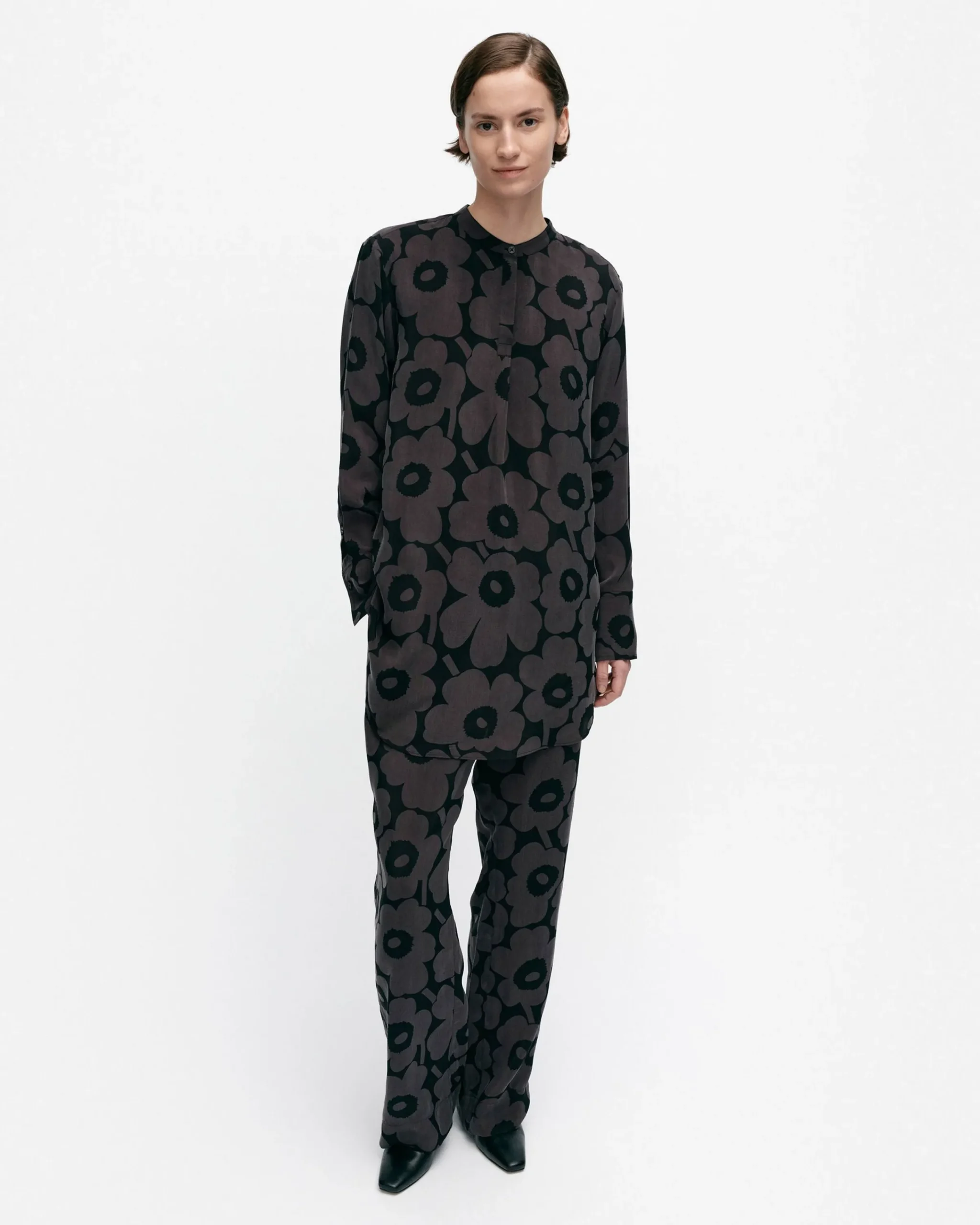 Hurmaava-Kupropaidassa On Niukka Istuvuus, A-Linjainen Leikkaus Sekä Unikko-Kuosi. Paidassa On Pystykaulus Ja Edessä Lyhyt Piilonappilista, Joka Päättyy Laskokseen. Paidassa On Selkäkaarroke Sekä Laskokset Takana, Napitettavat Mansetit Hihansuissa Ja Helmassa Pyöristetty Leikkaus.