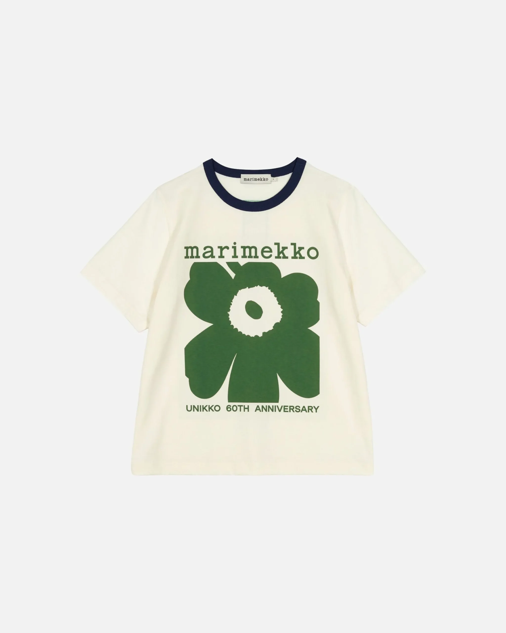Erna-T-Paita On Valmistettu Luomupuuvillatrikoosta Ja Siinä On Rento Istuvuus. T-Paidassa On Suuri Unikon 60-Vuotisjuhlavuosiprintti Etupuolella Ja Resori Pyöreässä Pääntiessä.