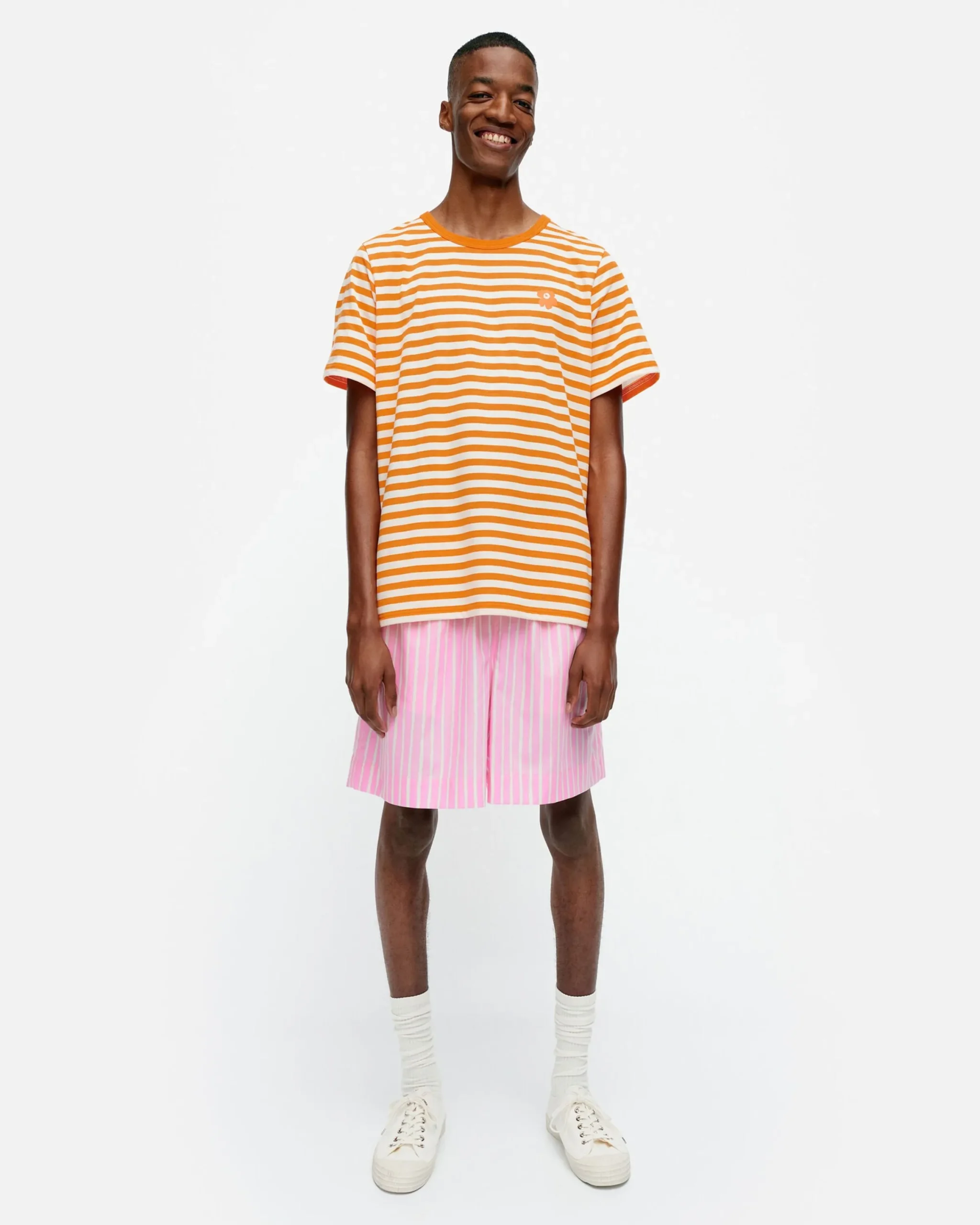 Shortsleeve-T-Paita On Valmistettu Puuvillatrikoosta Ja Siinä On Miesten Mitoitus. T-Paidassa On Tasaraita-Kuosi Ja Rintaan On Painettu Pieni Unikko-Kuosin Kukka. Pyöreä Pääntie On Viimeistelty Resorilla.
