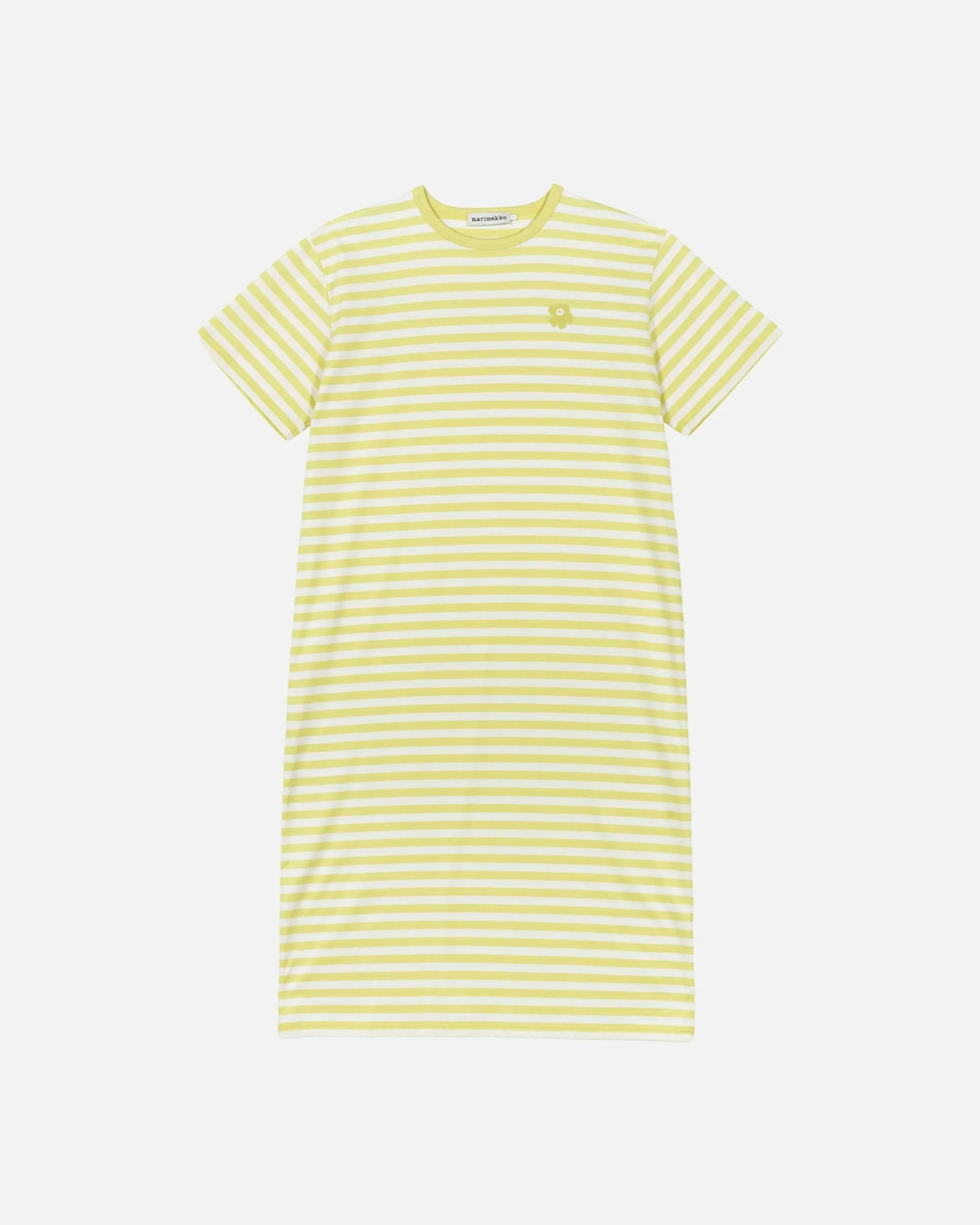 Oversized-T-Paita-Mekko On Valmistettu Puuvillatrikoosta Ja Siinä On Väljä Istuvuus. Mekossa On Tasaraita-Kuosi Ja Rintaan On Painettu Pieni Unikko-Kuosin Kukka. Pyöreä Pääntie On Viimeistelty Resorilla.