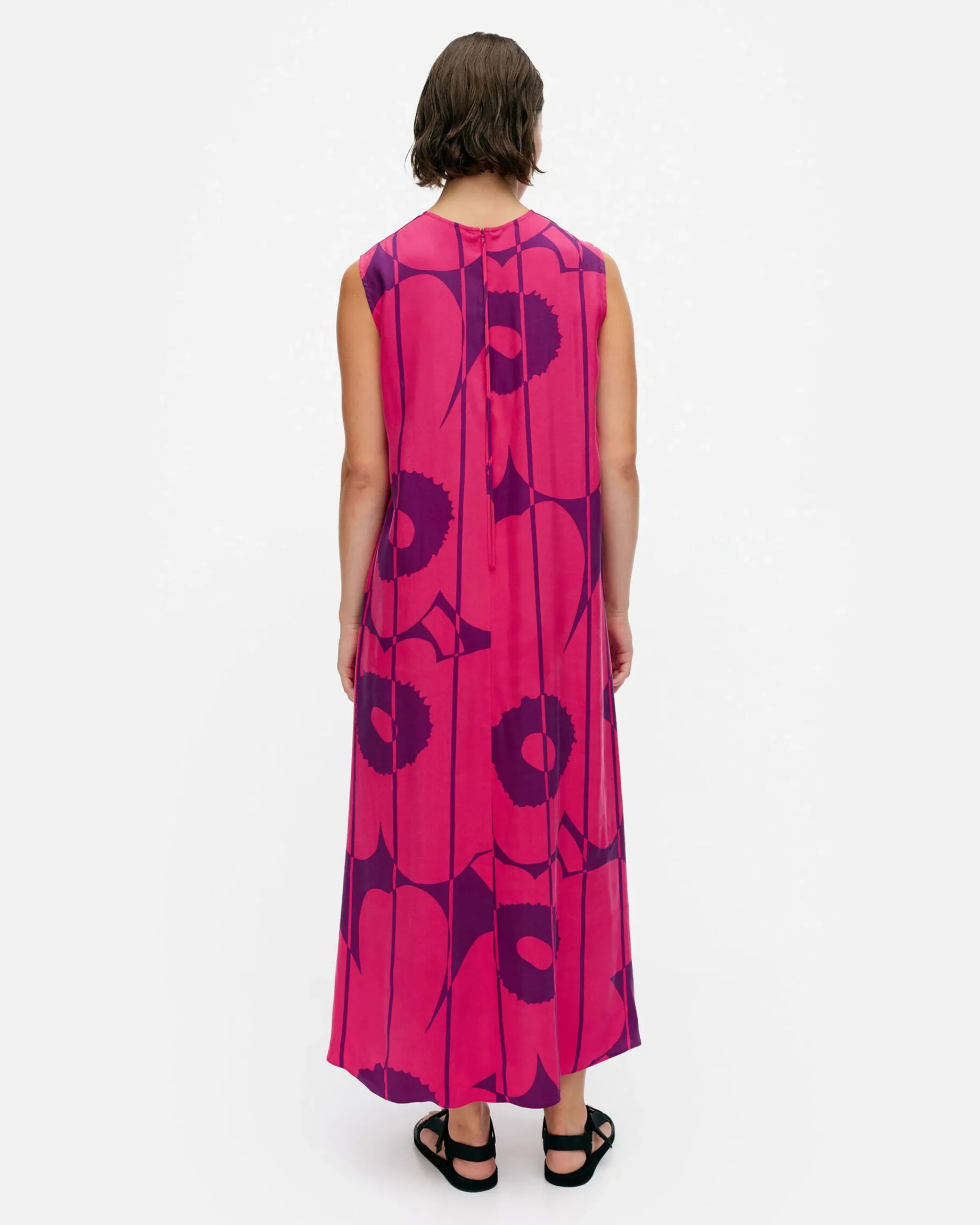 Migot-Mekossa On Niukka Istuvuus, A-Linjainen Leikkaus Ja Vesi Unikko -Kuosi. Hihattomassa Mekossa On Pyöreä Pääntie Ja Takapääntiellä Piilovetoketju, Jossa On Pitkät Vetonauhat. Sivusaumoissa On Taskut.