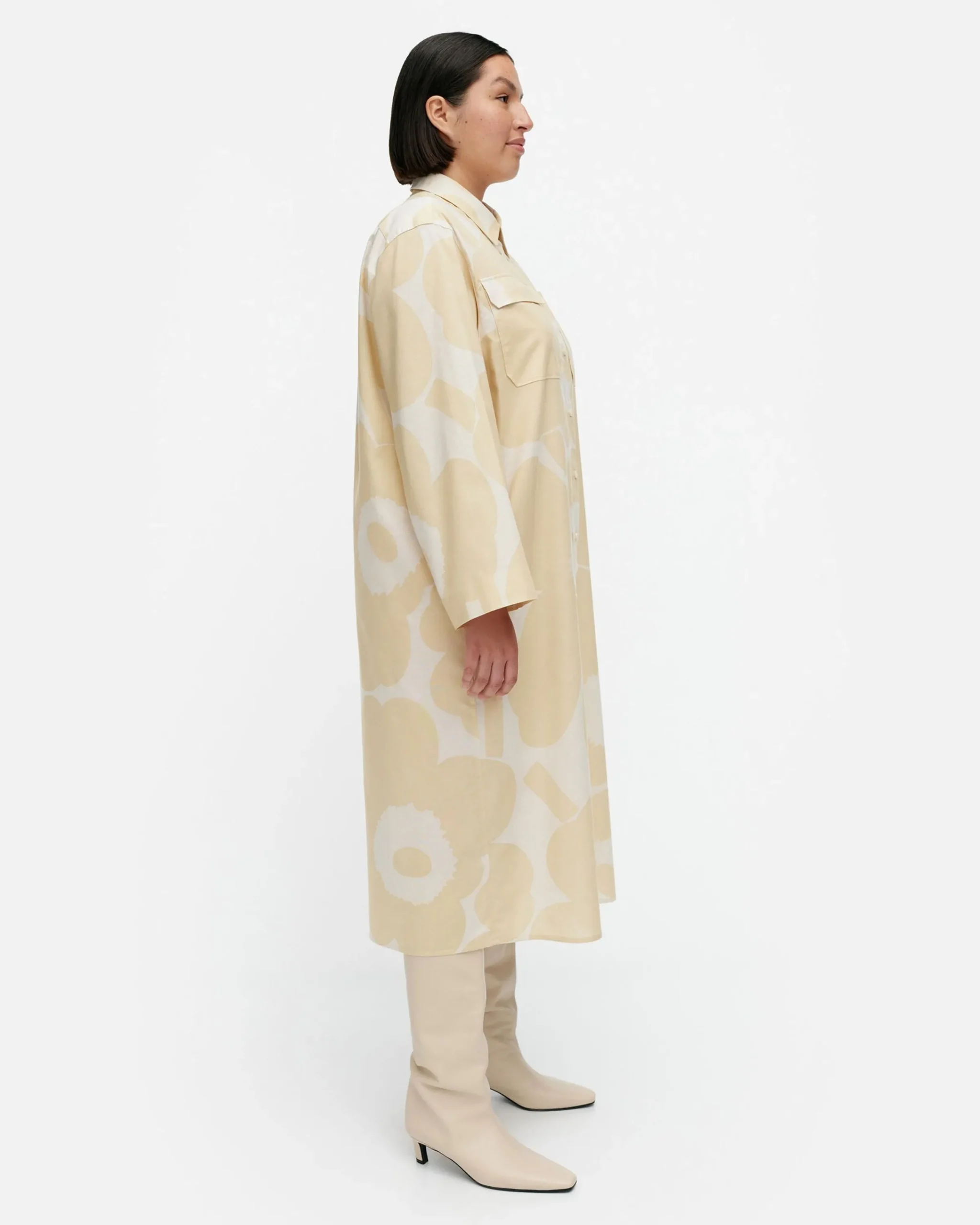 Monokromi-Paitamekossa On Rento Istuvuus, Suora Leikkaus Ja Unikko-Kuosi. Mekko On Valmistettu Chambray-Luomupuuvillakankaasta, Joka Antaa Vaatteelle Eläväisen, Meleeratun Pinnan. Mekossa On Paitakaulukset, Nappisuljenta Ja Rintataskut, Joista Vain Toisessa On Läppä. Sivusaumoissa On Taskut Ja Hihat Ovat Väljät. Takana On Selkäkaarroke Sekä Laskokset.