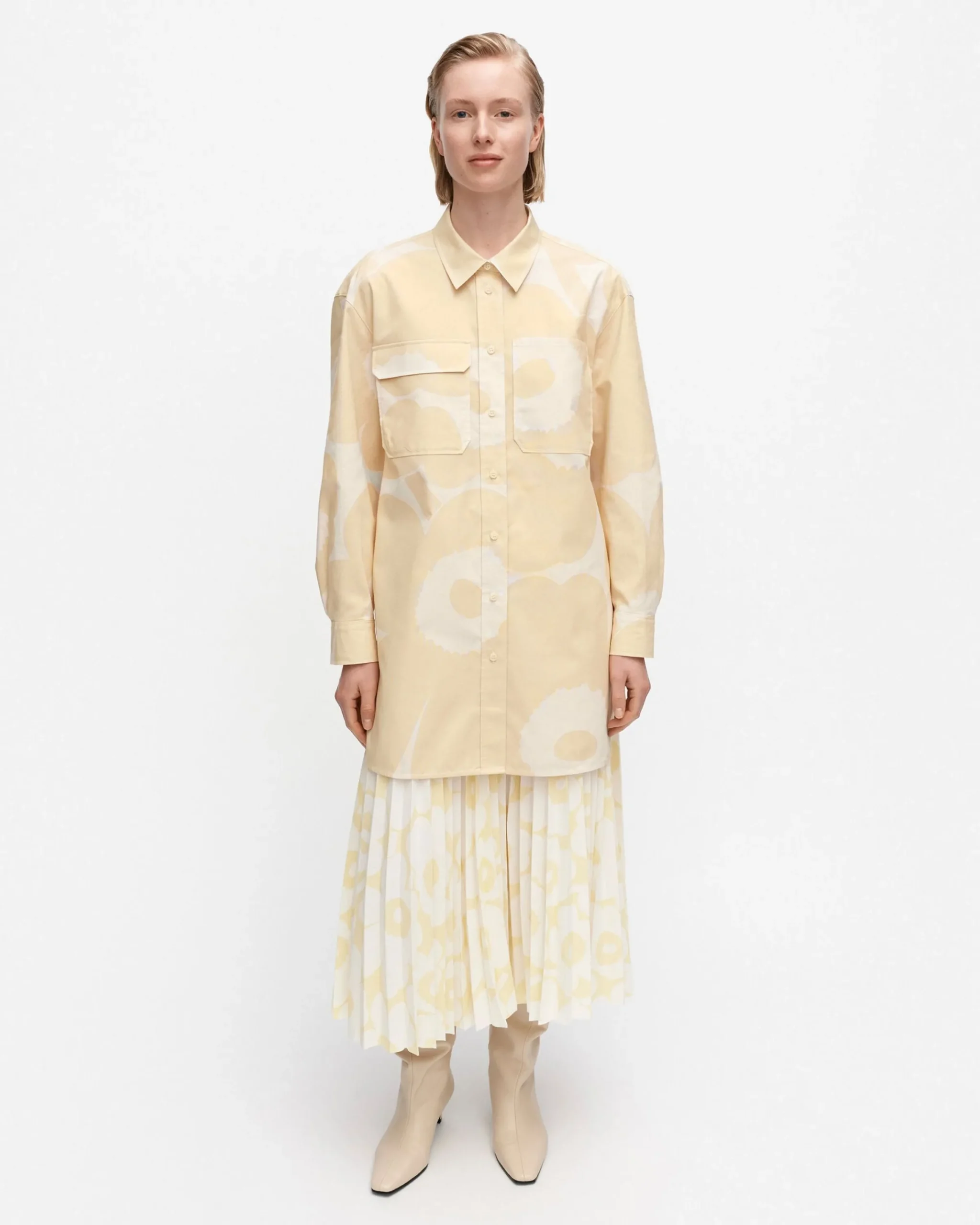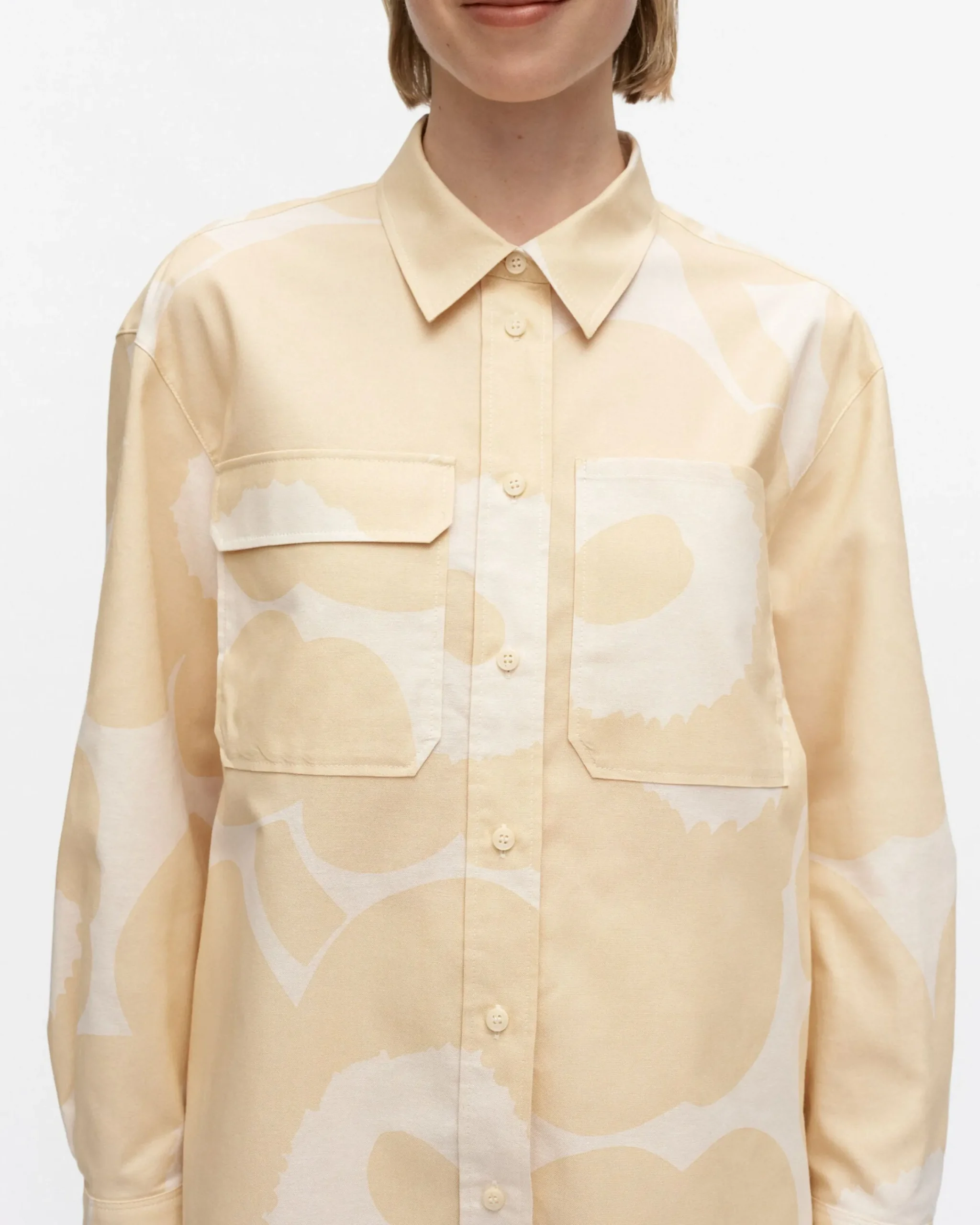 Mystiikka-Kauluspaidassa On Väljä Istuvuus, Suora Leikkaus Ja Unikko-Kuosi. Paita On Valmistettu Chambray-Luomupuuvillakankaasta, Joka Antaa Vaatteelle Eläväisen, Meleeratun Pinnan. Paidassa On Nappilista Ja Rintataskut, Joista Vain Toisessa On Läppä. Hihansuissa On Napitettavat Mansetit Ja Helmassa On Pyöristetty Leikkaus Ja Sivuhalkiot.